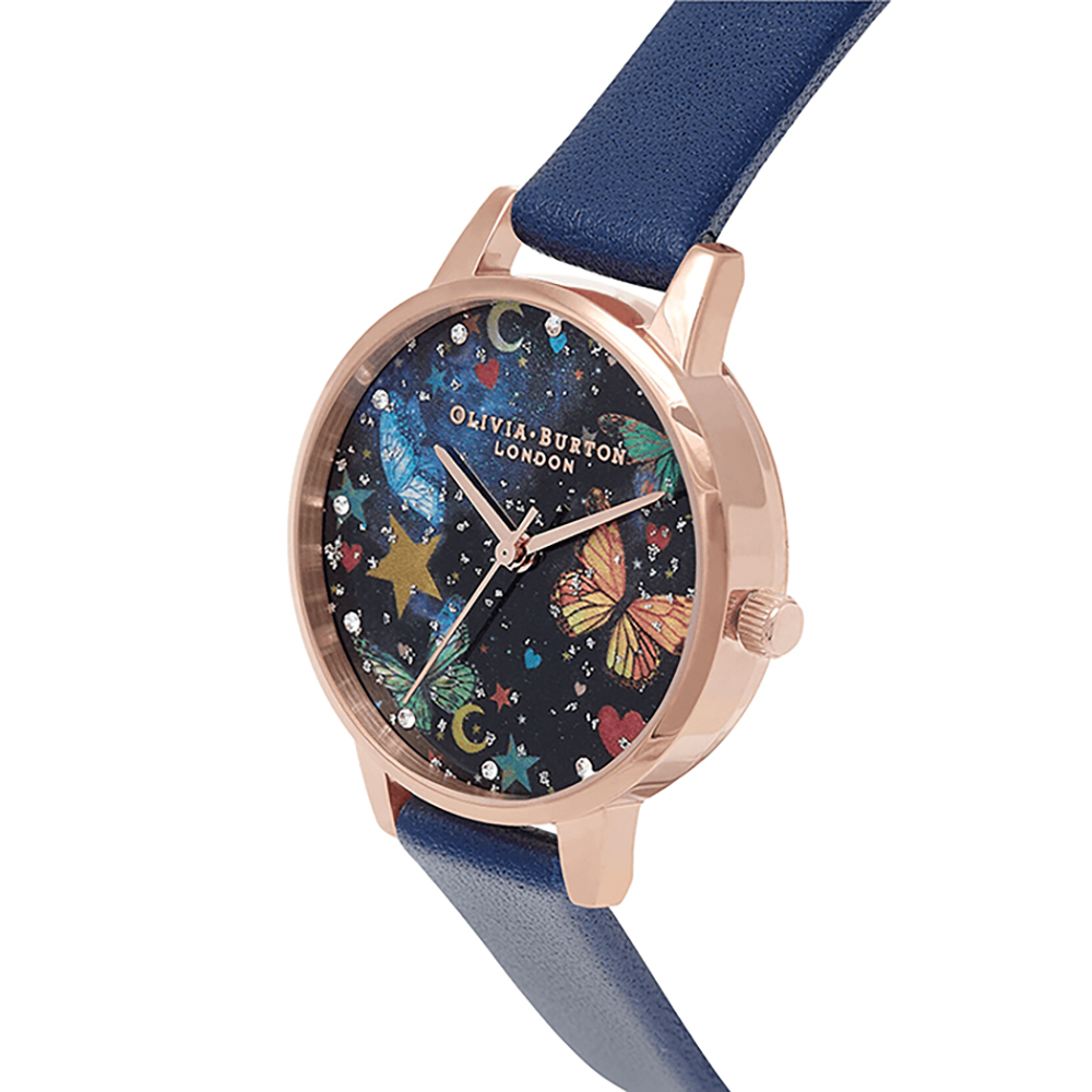 Discover the dark beauty of the Night Garden, a collection painting the secret enchantments of the natural world when the sun goes down. This style features a hypnotising 30mm midnight blue mother of pearl dial, with unexpected pops of shimmer, colourful charms and mystical butterfly motifs. Completed with a soft navy strap and gleaming rose gold case, this charmed timepiece is like a vivid dream of a distant midnight world.