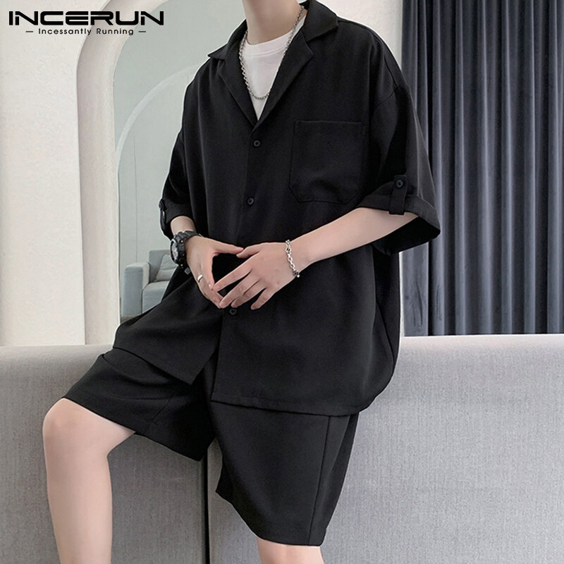 RisingHope Korea INCERUN 2PCS Mens Short Sleeve T Shirts Short Sleerwear Sets Sports Tracksuit Lounge Suit