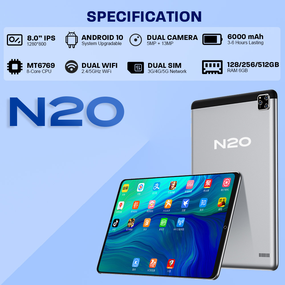 【2022 TOP1】BANOSS N20 Tablet PC 8 Inches Android 10 6000mAh 6GB RAM 512GB ROM Dual SIM 5G WiFi Gaming Online Classroom Meeting for Kids Children