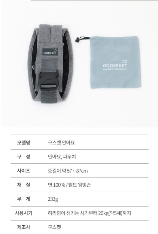 Model Name: gooseket baby hugSize: Length about 57~87cmMaterial: cotton 100%Weight: 233gWhen to use: Up to 20kg (about 5 years old) from the time when back strength occurs