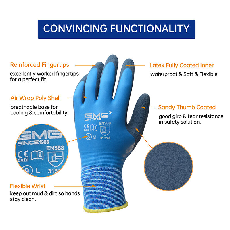 GMG safety gloves waterproof work gloves blue Polyester good adhesion wear resistant durable grey latex safety gloves work gloves good quality