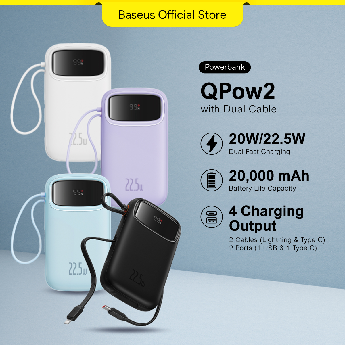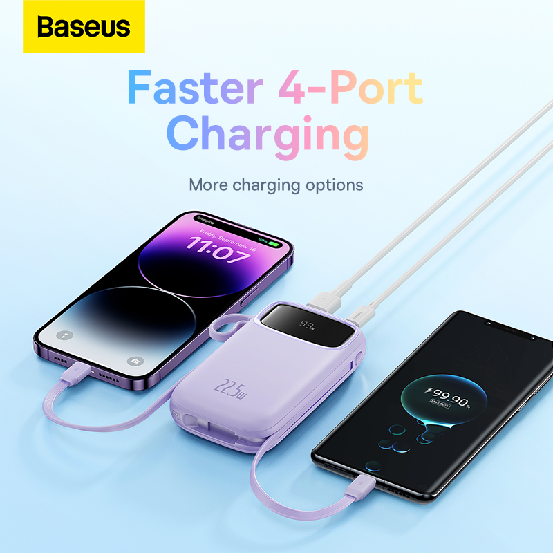 Baseus Double Cable Power Bank 20000mAh/10000mAh Digital Display 20W PD 4 Ports Fast Charging Built in Cables Portable Power Bank